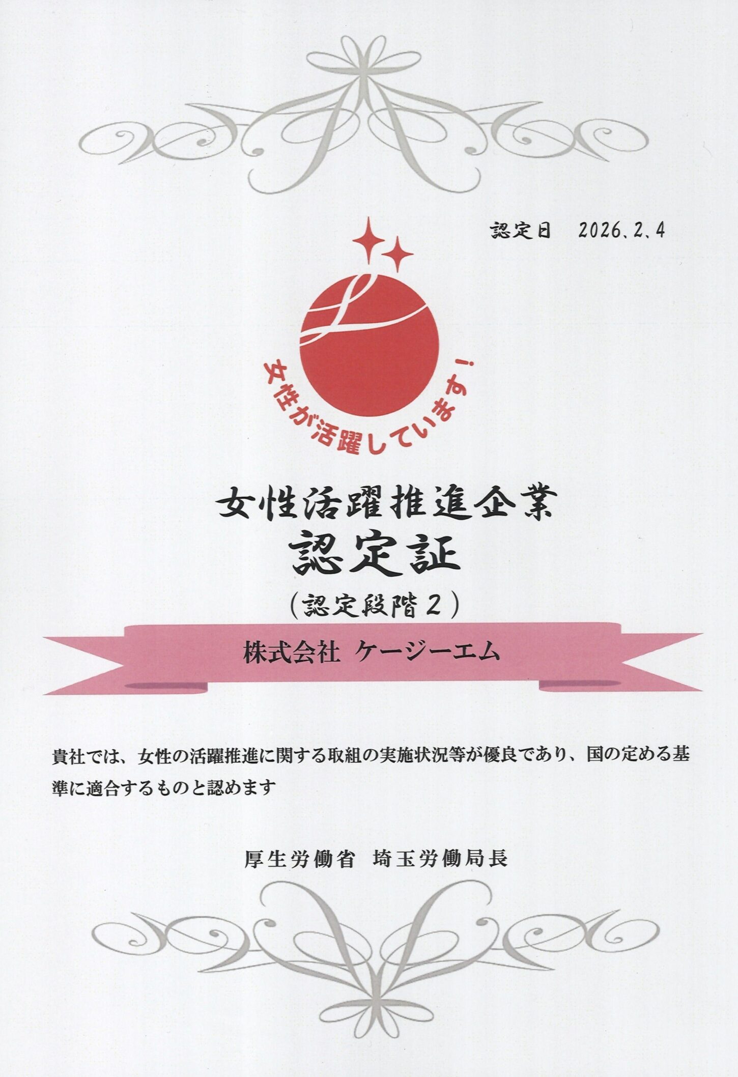 えるぼし認定を受けました2026.02.04当社では、女性が能力を十分に発揮できる職場環境作りを推進しており、時短勤務制度の拡充や年休・時間休取得の奨励、残業時間の削減等に取り組んできました。こうした取り組みを評価していただき、女性の活躍推進に関する状況等が優良な企業として「えるぼし認定(2つ星)」を受けました。今後も、女性が輝ける職場整備はもちろん、誰もが働きやすい職場環境作りを継続することで、職場と家庭のワークライフバランスを取りつつ、社員一人一人がその能力を存分に発揮できる会社を目指して参ります。
